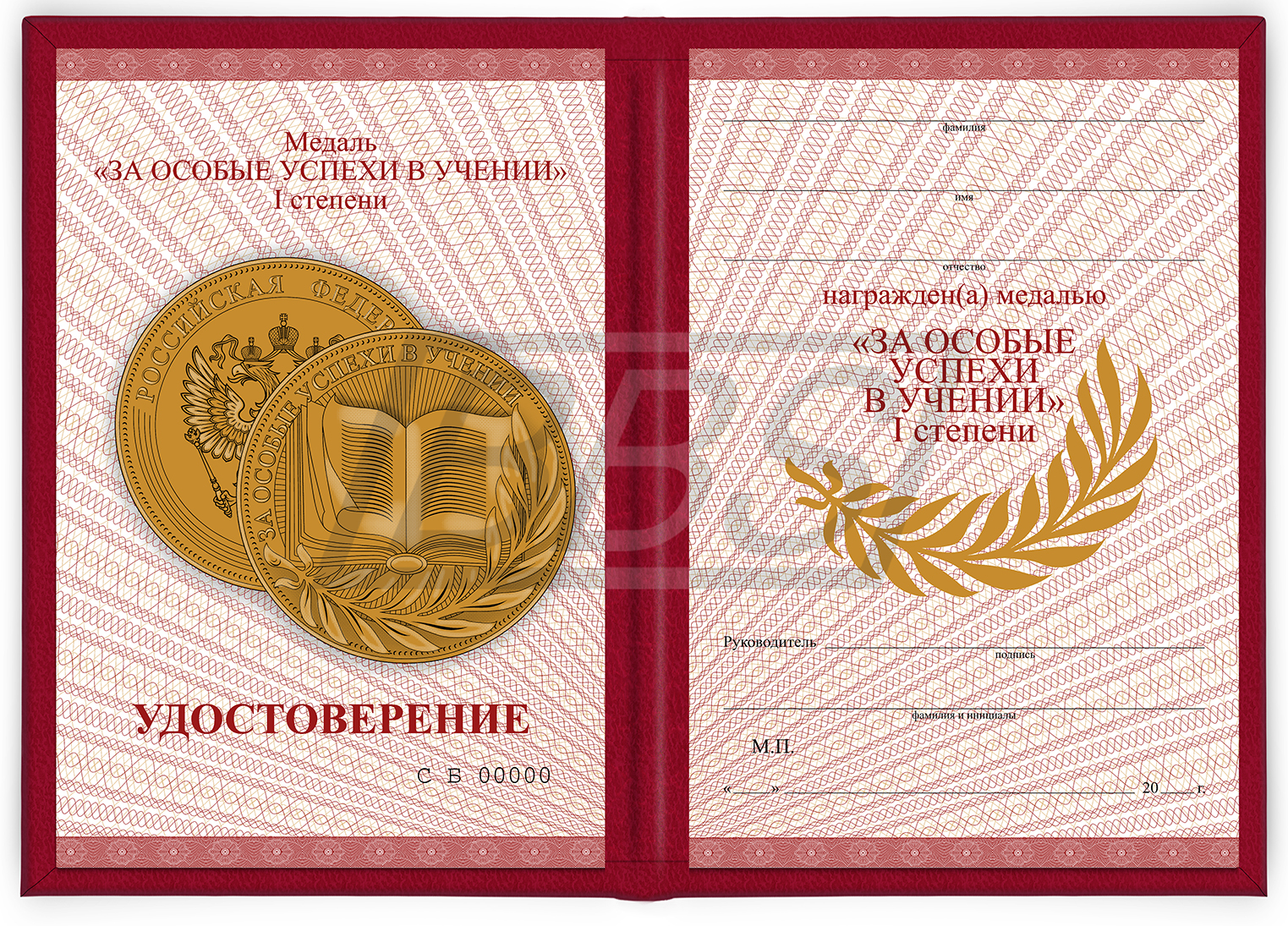 Удостоверение к золотой медали «За особые успехи в учении» I степени (на твердой обложке, номерное, большое) (арт. 61013)
