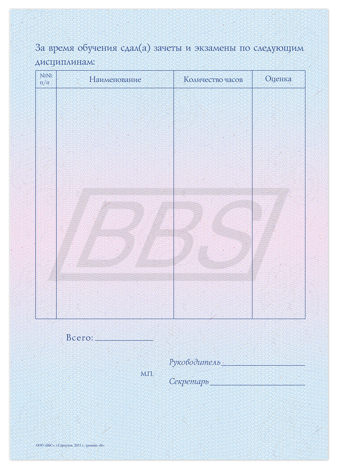 Приложение к диплому о профессиональной переподготовке, формат А5 (арт. 31007) (далее – Бланк) является защищённой от подделок полиграфической продукцией уровня «Б» и изготавливается по заказу образовательных организаций.